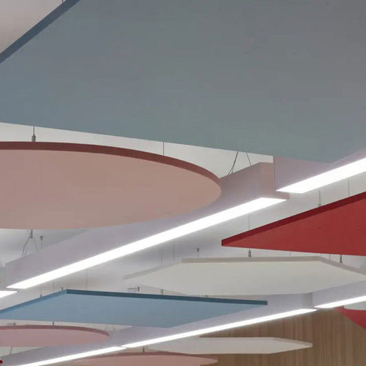 Las placas acústicas suelen estar hechas de PET, envueltas en tela o con fibra de vidrio pintada. Cada material tiene sus propias ventajas, sobre las que puede obtener más información en nuestros folletos de productos. El PET es un material similar al fieltro hecho a partir de botellas de plástico recicladas, la fibra de vidrio suele estar hecha a partir de botellas de vidrio recicladas y hay una variedad de acabados disponibles.
