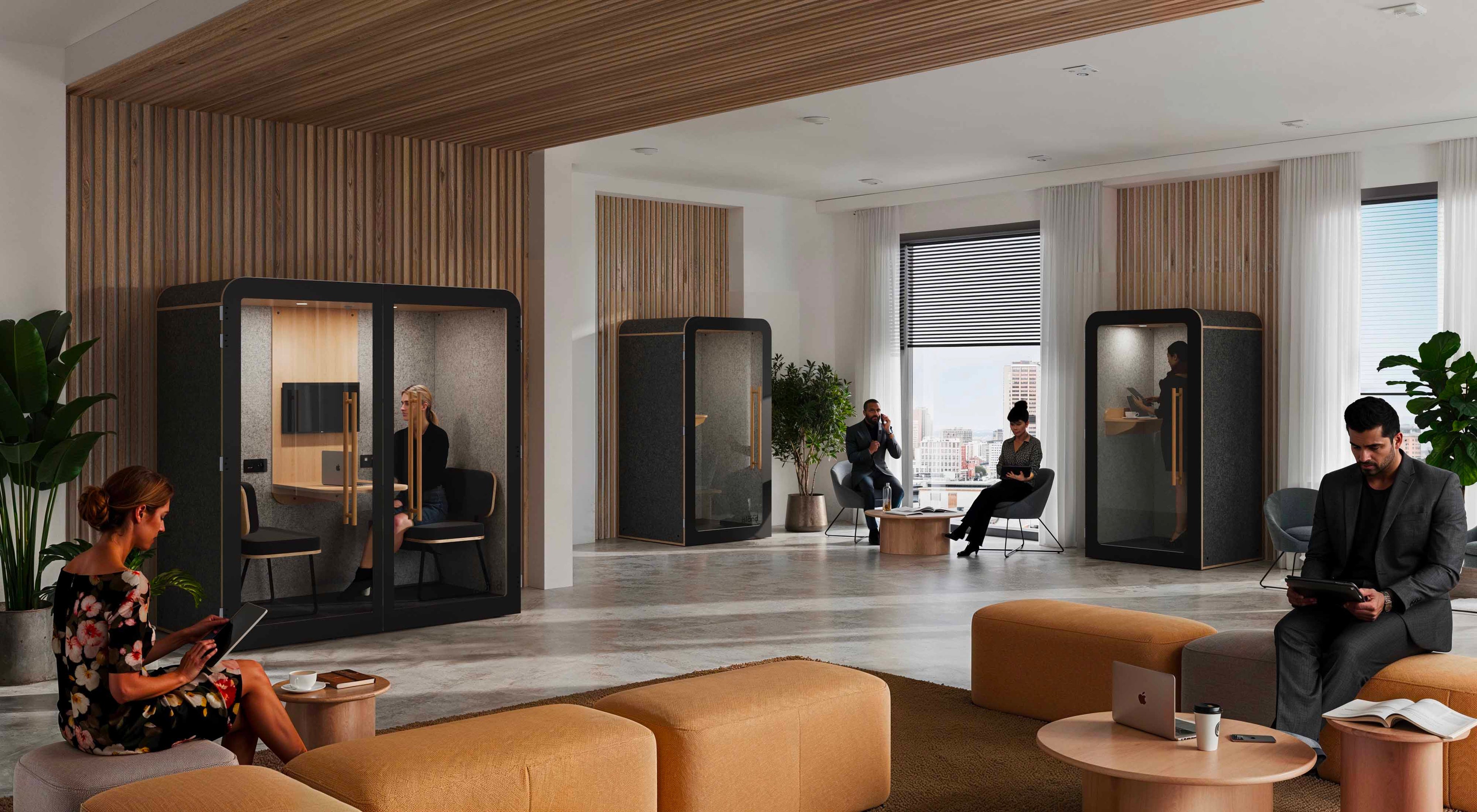 Los módulos para reuniones de Work With Island aportan una combinación perfecta de practicidad y estilo a los lugares de trabajo modernos. Diseñados para adaptarse perfectamente a cualquier configuración de oficina, estos módulos ofrecen un espacio privado e insonorizado para reuniones, llamadas o trabajo concentrado. Su diseño modular significa que puede crear la configuración ideal para su equipo sin la molestia de una gran construcción. Ya sea que esté buscando crear un rincón tranquilo en una oficina abierta concurrida o agregar un toque elegante y profesional a su espacio, estos módulos lo hacen simple y sin estrés.