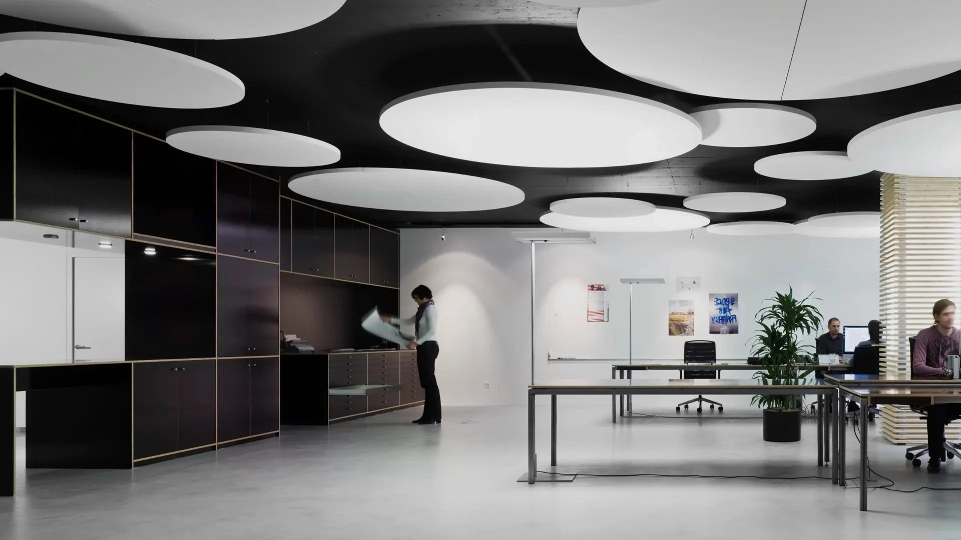 Ecophon SombraPaneles acústicos para techo con acabado negro mate, ideales para bares y...