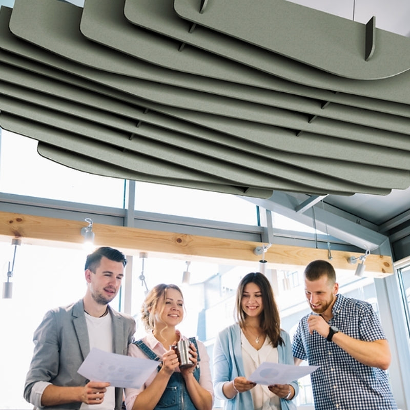 El techo acústico Orb de la serie StratoScape de Lumii ofrece una combinación de estética llamativa y excelente absorción del sonido. Diseñado a partir de material de fieltro mixto sostenible, elaborado con un 75 % de botellas de plástico recicladas, lo que lo hace respetuoso con el medio ambiente.