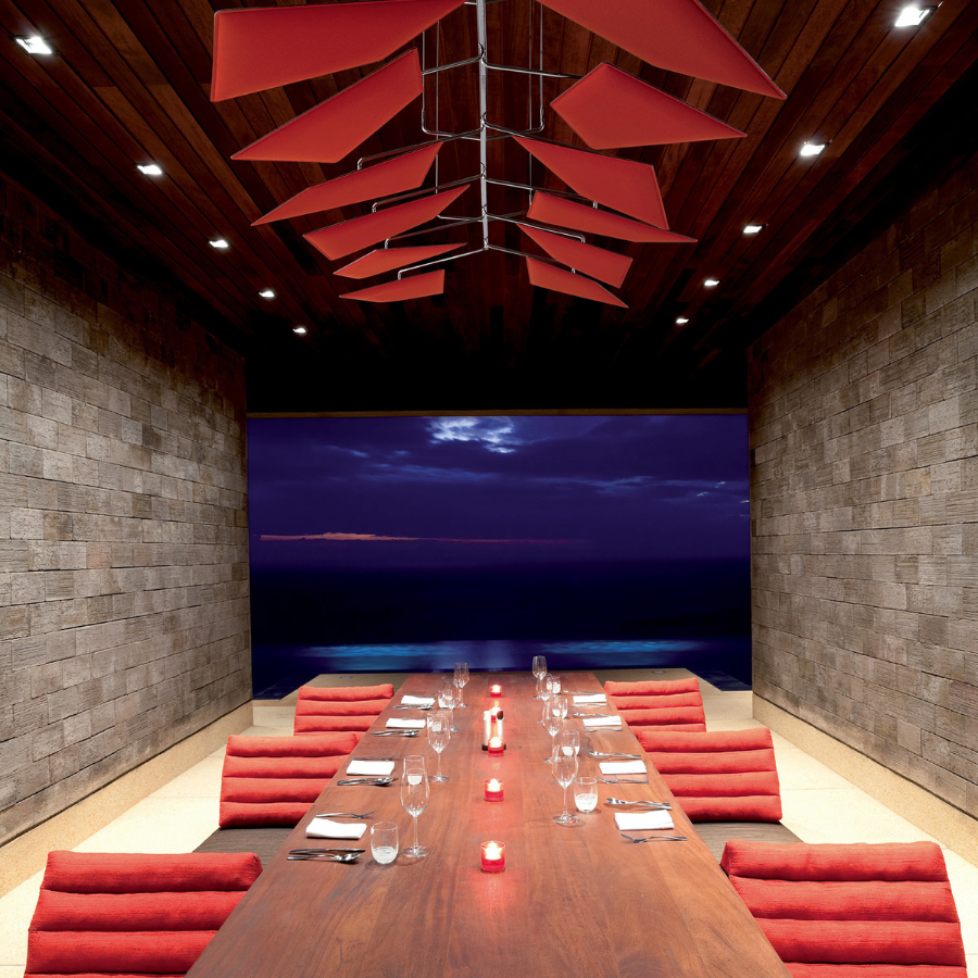 Crafted from chrome-plated steel, the Flap Chandelier ceiling-mounted frame features movable arms, each equipped with articulated hinges, to which the Flap panels are securely anchored in place. Each panel can be inclined and rotated to create planar, concave, or convex arrangements, allowing specific tailoring based on both acoustic and aesthetic requirements.